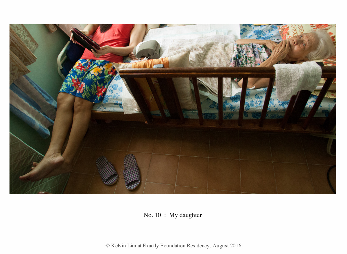Photograph by Kelvin Lim:  Josephine’s caregiver sleeps on the floor beside her. She wakes up every couple of hours to touch her through the bed railing, and check if she’s breathing normally.