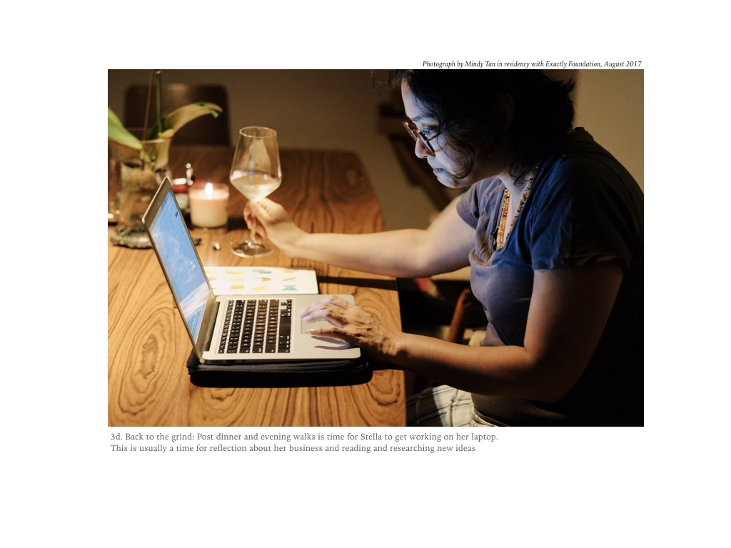 The photoshoots typically begin from the subject’s departure from her workplace, building up over several hours in the evening until she goes to bed. All the photos are executed using a documentary style of photography.