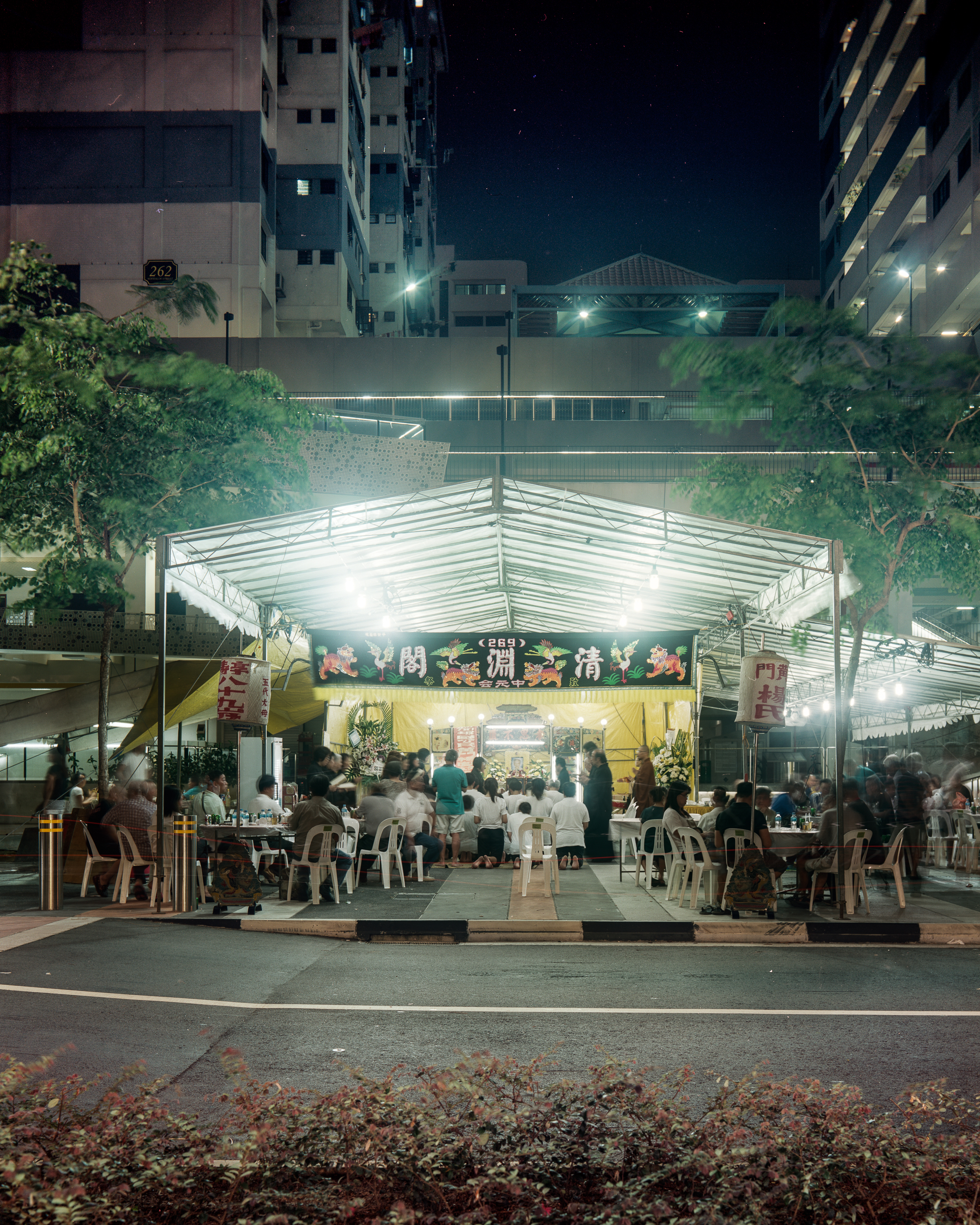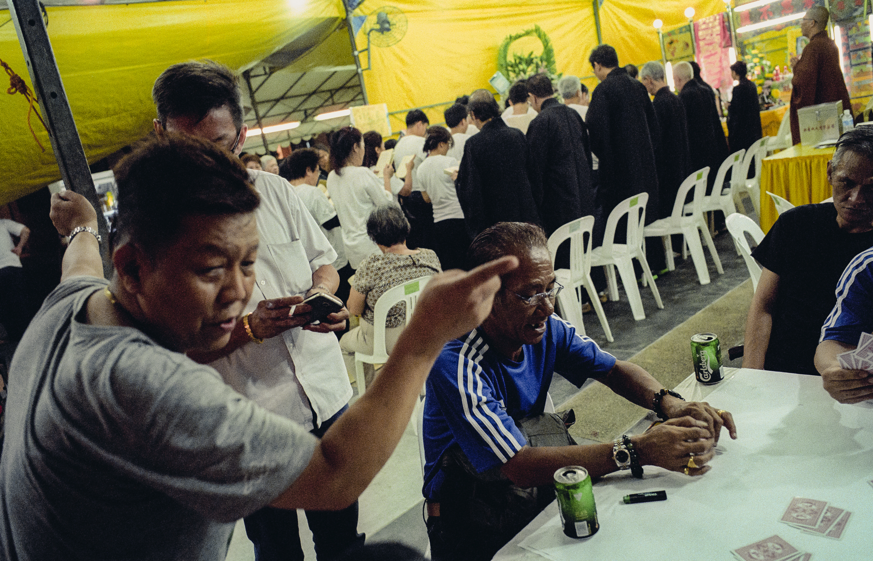 At the funeral held in the art space, Roy, who works the chicken rice stall comes up to me. “Many photos tonight?” he asks. “A few” I reply. He gestures with a nod at the gathering around us. “My relatives.” He states.